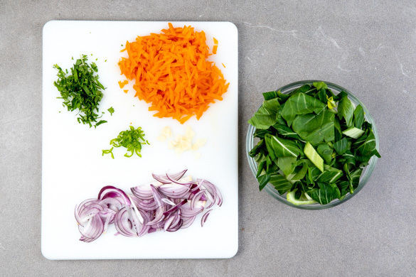 Den Pak Choi in 1–2cm breite Streifen schneiden. Die Karotten schälen und mit einer Küchenreibe grob raspeln. Die Zwiebeln schälen, halbieren und in feine Streifen schneiden. Den Knoblauch schälen und in feine Scheibchen schneiden. Die Chilischote längs halbieren, entkernen und in feine Streifen schneiden. Den Koriander samt Stängeln fein schneiden.