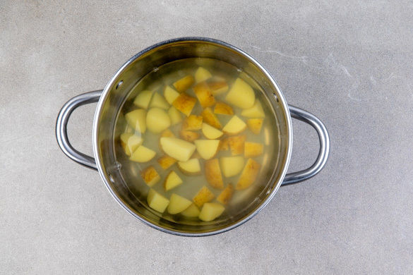 Die Kartoffeln samt Schale in 2–3cm große Würfel schneiden. In einen mittelgroßen Topf mit ausreichend gesalzenem Wasser geben, zum Kochen bringen und in ca. 15Min. gar kochen. In ein Sieb abgießen und abtropfen lassen. Tipp: Die Kartoffeln sind durch, wenn sie sich bei der Messerprobe leicht vom Messer lösen.