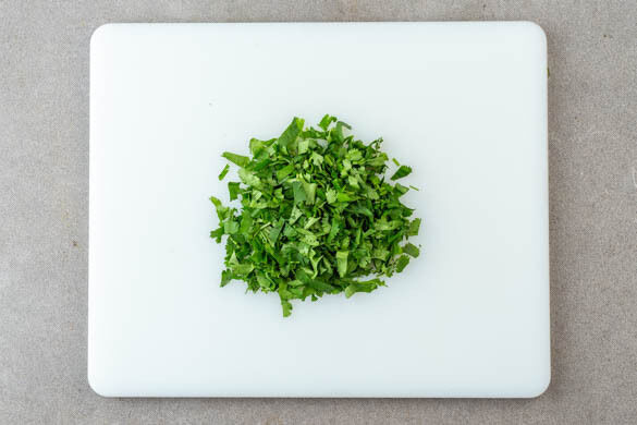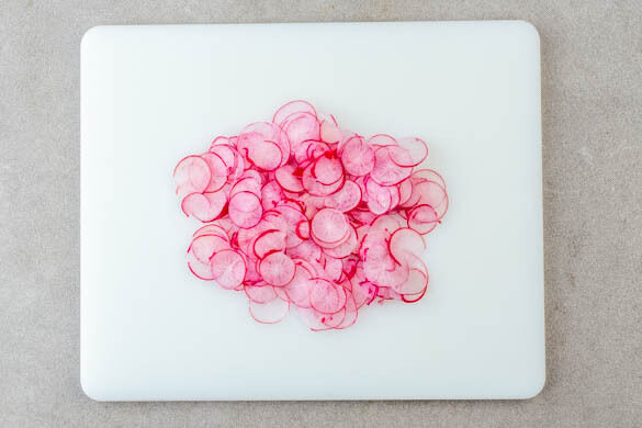 Die Radieschen in sehr dünne Scheiben schneiden und mit dem Dressing vermengen. Tipp: Wenn vorhanden, die Radieschen mit einem Gemüsehobel schneiden.