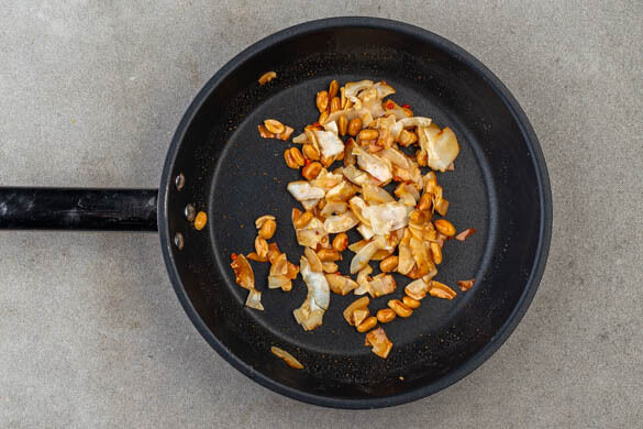 Die ½ der Chilischote in dünne Ringe schneiden. Mit den Kokosflocken und den Erdnüssen in einer kleinen Pfanne mit ¼TL Honig bei mittlerer Hitze unter regelmäßigem Rühren ca. 2Min. anrösten, bis sich der Honig aufgelöst hat.