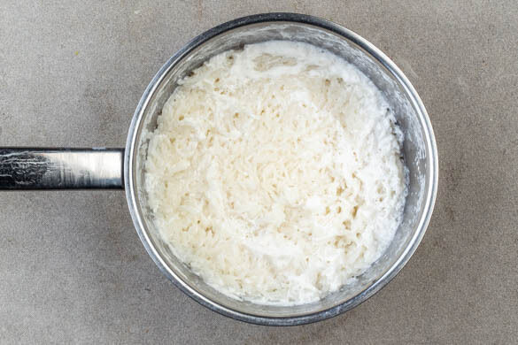 Den Reis in einem Sieb kalt abspülen, bis das Wasser klar bleibt. Mit der Kokosmilch, 400ml Wasser und 1 kräftigen Prise Salz in einen mittelgroßen Topf geben. Zum Kochen bringen, dann abgedeckt bei niedrigster Hitze unter gelegentlichem Rühren 10–12Min. kochen, bis die Flüssigkeit aufgesogen und der Reis gar ist.