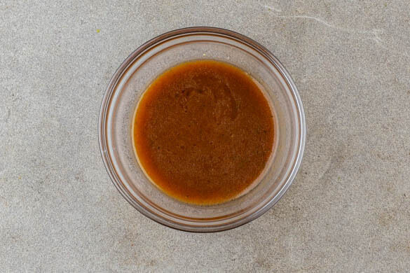 Die Limettenschale abreiben, dann die Limetten halbieren und auspressen. 1TL Limettenschale, den Limettensaft, 4EL Pflanzenöl, die Misopaste und 4TL Honig zu einem Dressing verrühren.