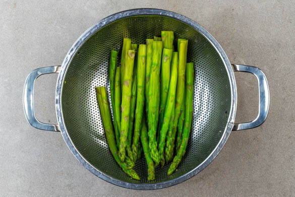 In einem großen Topf ausreichend gesalzenes Wasser für den Spargel zum Kochen bringen. Die hölzernen Enden des Spargels schälen und dickere Stangen längs halbieren. Sobald das Wasser kocht, den Spargel hineingeben und 2–3Min. kochen. Den Spargel in einem Sieb mit kaltem Wasser abspülen und abtropfen lassen.