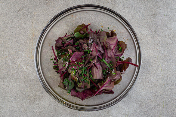 Die Rindfleischpattys in derselben Pfanne mit 1EL Olivenöl bei mittlerer bis starker Hitze auf jeder Seite 3–4Min. gar braten, dabei die Zwiebelstreifen mit 1 kräftigen Prise Salz um die Pattys verteilen und mitbraten. 1EL Olivenöl, 1EL Balsamicoessig, ½TL Honig und je 1 Prise Salz und Pfeffer zu einem Dressing verrühren.