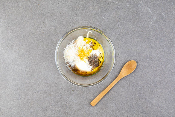 Die Mayonnaise mit 1/3 des Joghurts, der Worcestershiresauce und 1–2EL Olivenöl verrühren. Den geriebenen Parmesan unterrühren und mit Salz, Pfeffer, Zitronensaft sowie -schale nach Geschmack würzen. Wer mag, kann auch mehr Joghurt verwenden.