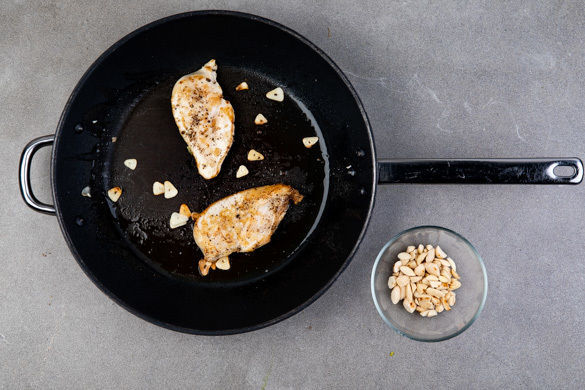 Das Fleisch trocken tupfen, der Länge nach in 2 dünne Schnitzel schneiden und mit Salz und Pfeffer würzen. Die Mandeln in einer mittleren Pfanne bei mittlerer Hitze 3–4Min. ohne Fett anrösten, dann grob hacken und beiseitestellen. Das Fleisch in derselben Pfanne mit 1–2EL Olivenöl auf jeder Seite 2–3Min. scharf anbraten. Den Knoblauch dazugeben und die Pfanne vom Herd nehmen.