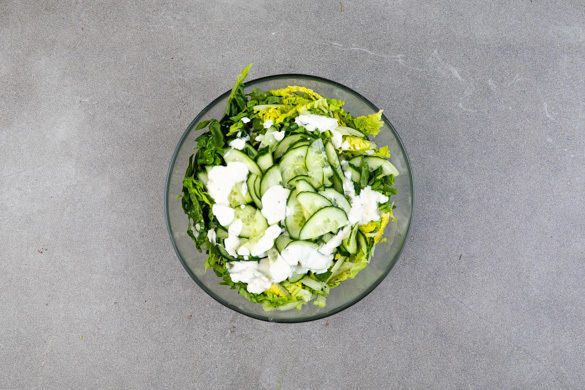 Den Salat in feine Streifen schneiden. Die Gurke der Länge nach halbieren und schräg in dünne Scheiben schneiden. Die Zitronenschale abreiben, dann die Zitrone halbieren und auspressen.