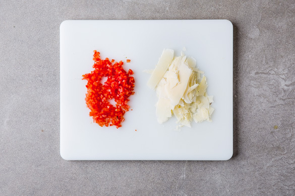 Die Tomaten halbieren, entkernen und in kleine Würfel schneiden. Den Käse mit einem Sparschäler in feine Scheiben hobeln.