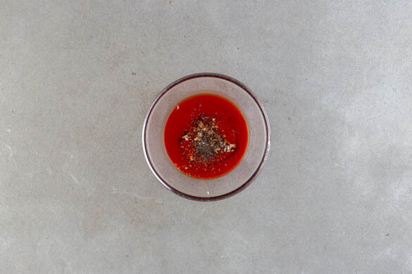 Den Backofen auf 240°C (220°C Umluft) vorheizen. Den Knoblauch schälen und fein würfeln oder durch eine Knoblauchpresse drücken. Die Tomatensauce mit dem Knoblauch und 1EL Balsamicoessig verrühren und mit Salz und Pfeffer würzen.