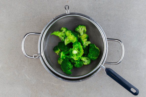 In einem mittelgroßen Topf ausreichend gesalzenes Wasser für den Brokkoli zum Kochen bringen. Den Brokkoli in mundgerechte Röschen schneiden, in das kochende Wasser geben und bei mittlerer bis starker Hitze 3–5Min. kochen, bis er strahlend grün und bissfest ist. In ein Sieb abgießen und abtropfen lassen.