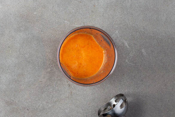 Die Tomaten vierteln und in einem hohen Gefäß mit 1EL Olivenöl fein pürieren.