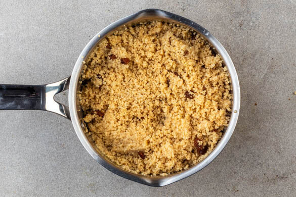 In einem mittegroßen Topf 600ml leicht gesalzenes Wasser zum Kochen bringen. Währenddessen die Minze- und Petersilienblätter von den Stängeln zupfen und fein hacken. Die Petersilienstängel fein schneiden. Den Topf vom Herd nehmen, den Couscous, 1TL Brühgewürz und die Rosinen ins Wasser rühren und abgedeckt 6–8Min. quellen lassen.