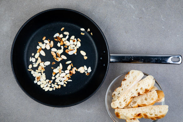 Die Mandelblättchen in einer kleinen Pfanne ohne Zugabe von Fett 2–3Min. rösten. Das Naanbrot in breite Streifen schneiden. Das Süßkartoffel-Dal-Püree mit dem Spinat-Tomaten-Salat und dem Naanbrot auf Tellern anrichten. Mit der restlichen Petersilie, den Zitronenspalten und den Mandelblättchen garnieren und servieren.