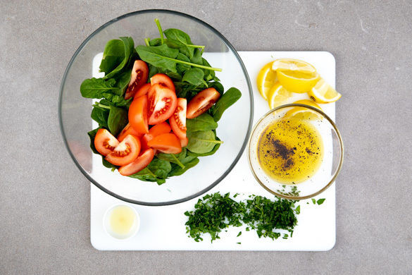 Die Zitrone halbieren. Eine Hälfte in Spalten schneiden, die andere Hälfte auspressen. Die Petersilienblätter abzupfen und grob hacken. Die Tomaten achteln. Für das Dressing je 1EL Olivenöl, Essig und Wasser mit Salz und Pfeffer verrühren. Ca. 3/4 der Petersilie, die Tomaten und den Spinat mit dem Dressing vermengen.