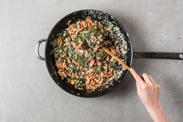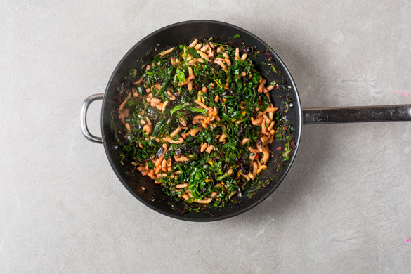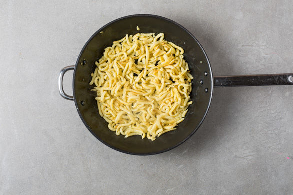 Den Mangold mit 200ml Wasser in die Pfanne geben und den Kümmel sowie Salz und Pfeffer unterrühren. Auf mittlerer Hitze abgedeckt 6–8Min. köcheln lassen, bis das Wasser verdunstet ist. Dann die Spätzle untermengen.