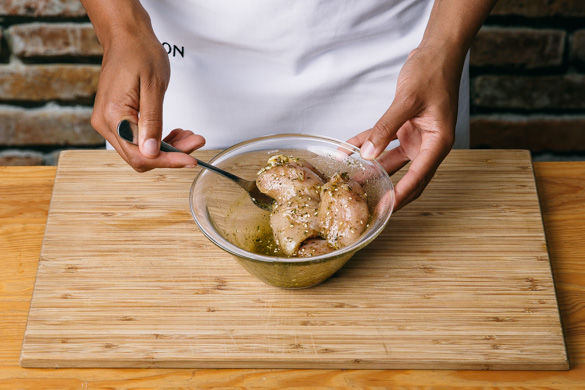 Die Hähnchenstücke samt Gewürzöl in einer mittelgroßen, ofenfesten Pfanne bei starker Hitze auf jeder Seite ca. 1Min. anbraten. Anschließend im Ofen 10–12Min. garen, bis das Fleisch durch ist. Tipp: Wer keine ofenfeste Pfanne hat, kann das Fleisch auch in eine Auflaufform geben.