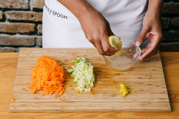 Die Karotte schälen und mit einer Küchenreibe grob raspeln. Den Apfel schälen und ebenfalls grob reiben, dabei das Kerngehäuse aussparen. Die Zitronenschale abreiben, dann die Zitrone halbieren und auspressen.