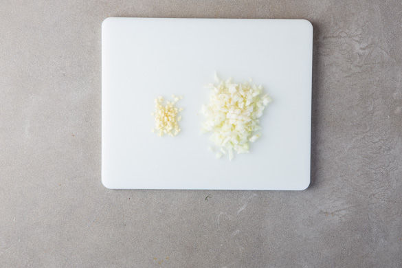 Die Zwiebeln schälen, halbieren und in feine Würfel schneiden. Die Knoblauch schälen und ebenfalls fein würfeln.