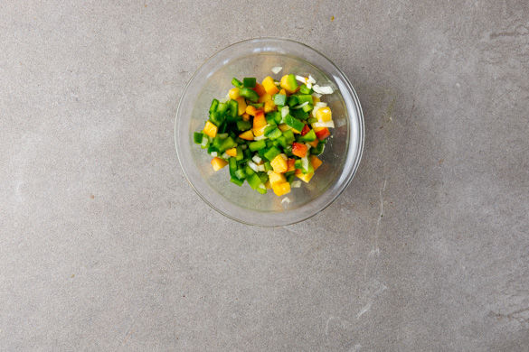 Die Paprika halbieren, entkernen und in kleine Würfel schneiden. Den Pfirsich halbieren, den Stein entfernen und den Pfirsich ebenfalls in kleine Würfel schneiden. Die restlichen Zwiebeln mit den Pfirsichwürfeln und der Paprika vermengen und mit 1EL Olivenöl, 1EL Essig sowie Salz und Pfeffer abschmecken.