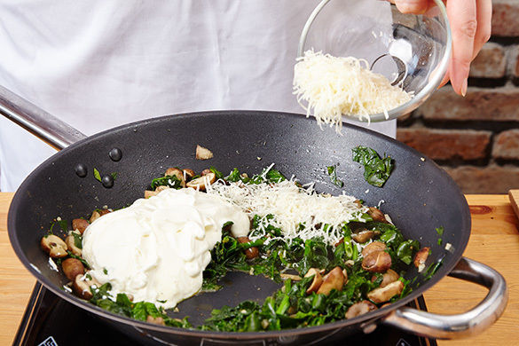 Die Pilze in einer großen Pfanne mit 1–2EL Olivenöl bei mittlerer Hitze 3–5Min. braten, bis sie leicht braun werden. Den zerkleinerten Spinat und den Knoblauch hinzufügen und ca. 2Min. mitbraten, bis der Spinat zusammenfällt.