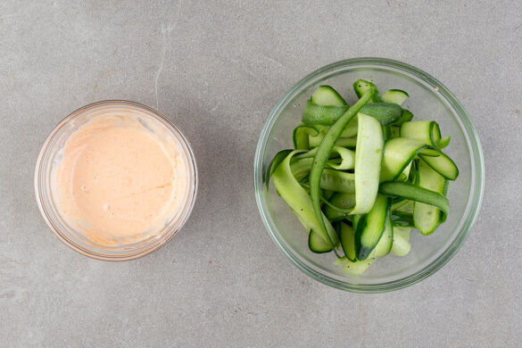 Die Gurken mit 3EL Zitronensaft sowie je 1 Prise Salz und Pfeffer vermengen. Die Sriracha-Sauce mit 4EL veganer Mayonnaise, dem Knoblauch und 2EL Zitronensaft verrühren.