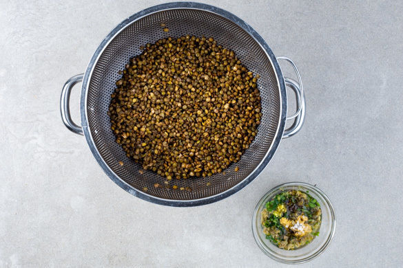 Die Linsen in einem Sieb abtropfen lassen und zurück in den Topf geben. Den Ahornsirup mit dem Zitronensaft, 1TL Zitronenschale, ca. ⅓ der Kräuter, den Kapern, 2EL Olivenöl, 1EL Senf sowie je ½TL Salz und Pfeffer zu einem Dressing verrühren und mit den Paprikawürfeln unter die Linsen mengen.
