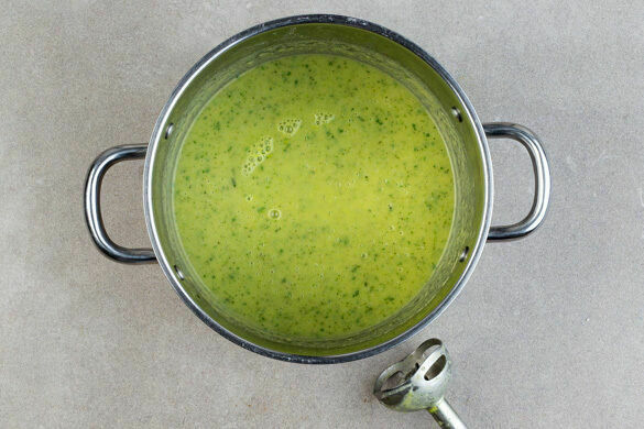 Die Zucchini, die Kartoffeln, die Zwiebeln und den Knoblauch in einem großen Topf mit 3EL Olivenöl und 1 Prise Salz bei mittlerer Hitze 2–3Min. anbraten. 1L heißes Wasser angießen, das Brühgewürz unterrühren und das Gemüse bei mittlerer Hitze ca. 10Min. köcheln lassen.