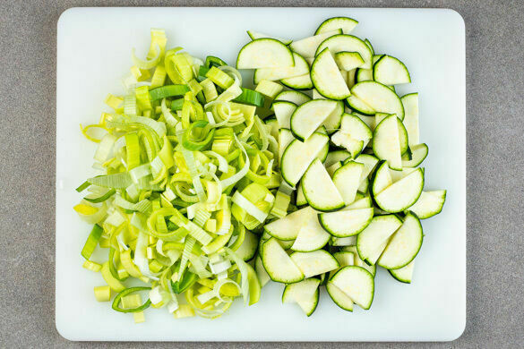 Den Lauch längs halbieren und quer in feine Streifen schneiden. Die Zucchini ebenfalls längs halbieren und quer in dünne Scheiben schneiden.