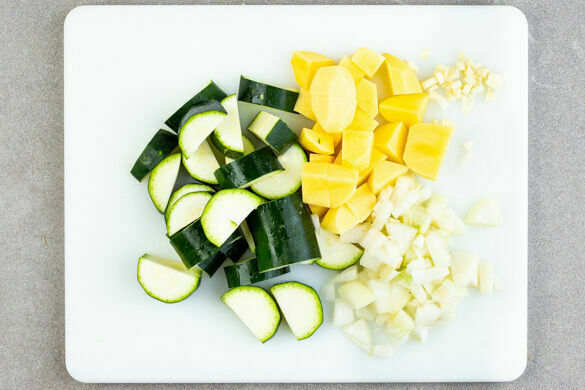 Den Backofen auf 220°C (200°C Umluft) vorheizen. Die Zucchini längs halbieren und in grobe Stücke schneiden. Die Kartoffeln schälen und grob würfeln. Die Zwiebel und den Knoblauch schälen und ebenfalls grob würfeln.