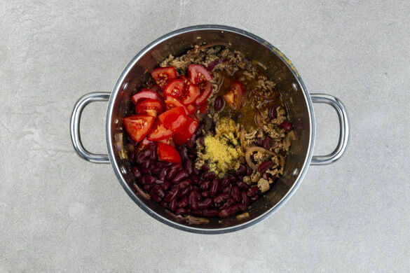 Die Zwiebelstreifen, das vegane Hack und 1–2TL Gewürzmischung in einem großen Topf mit 1EL Olivenöl bei mittlerer Hitze 3–4Min. anbraten. Die Tomaten und die Bohnen mit 1TL Salz zugeben, 150ml Wasser angießen und das Chili abgedeckt ca. 10Min. köcheln lassen. Mit Salz und Pfeffer abschmecken.