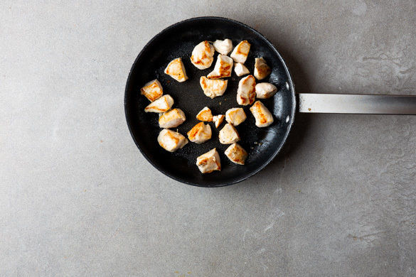 Das Fleisch mit etwas Küchenkrepp trocken tupfen und in 2–3cm große Würfel schneiden. Die Pfanne erneut mit 1–2EL Olivenöl mittelhoch erhitzen und die Hähnchenwürfel von allen Seiten goldbraun anbraten, dabei nicht zu oft umrühren. Nebenher die Hoisinsauce mit dem Knoblauch, dem Ingwer sowie Salz und Pfeffer zu einer Würzsauce verrühren.