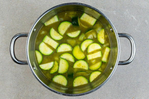 Die Zucchini, die Kartoffeln, die Zwiebeln und den Knoblauch in einem großen Topf mit 3EL Olivenöl und 1 Prise Salz bei mittlerer Hitze 2–3Min. anbraten. 1L heißes Wasser angießen, das Brühgewürz unterrühren und das Gemüse bei mittlerer Hitze ca. 10Min. köcheln lassen.