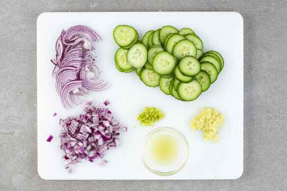 Die Zwiebel schälen und halbieren, eine Hälfte in feine Streifen schneiden, die andere Hälfte fein würfeln. Die Gurke in dünne Scheiben schneiden. Die Limettenschale abreiben, dann die Limette halbieren und auspressen. Den Ingwer und den Knoblauch schälen und fein würfeln.