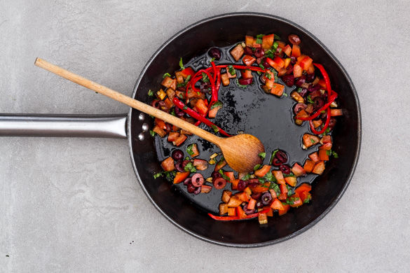 Währenddessen den Knoblauch schälen und fein würfeln. Die Chilischote längs halbieren, je nach Schärfewunsch entkernen und in feine Streifchen schneiden. Die Oliven ebenfalls in feine Streifen schneiden. Die Tomate vierteln, dann in feine Würfel schneiden.
