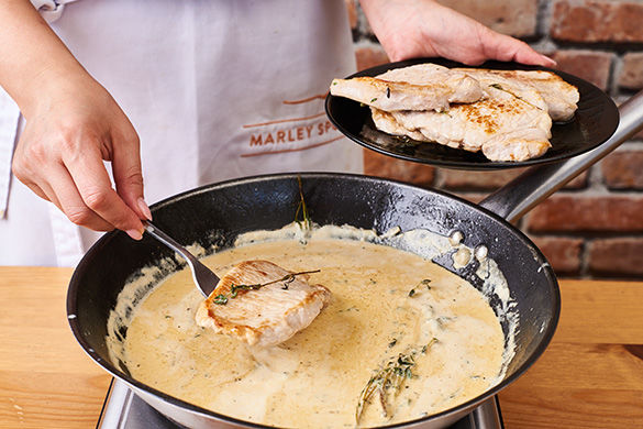 Die Steaks in die eingedickte Sauce legen und darin bei niedriger Hitze 3–4Min. gar ziehen lassen. Ca. 3/4 der Petersilie untermischen und die Sauce mit Salz und Pfeffer abschmecken. Die Steaks mit der Rahmsauce und den Schupfnudeln anrichten und mit der restlichen Petersilie garniert servieren.