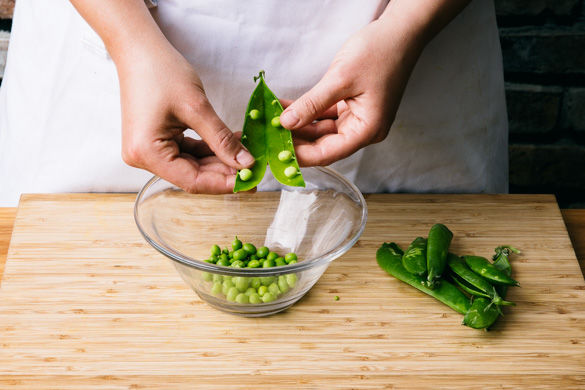 In der Zwischenzeit die Erbsen aus den Hülsen lösen.