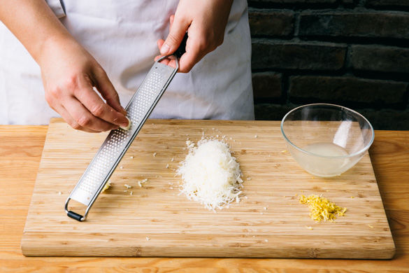 Den Käse fein reiben. Die Zitronenschale abreiben, dann die Zitrone halbieren und auspressen. Den Knoblauch schälen und fein reiben oder würfeln.