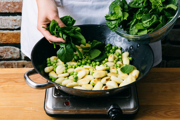 In einem großen Kochtopf ausreichend gesalzenes Wasser für die Gnocchi zum Kochen bringen. Die Gnocchi in das kochende Wasser geben und 4–5Min. bei mittlerer Hitze köcheln, bis sie gar sind. In ein Sieb abgießen und abtropfen lassen.