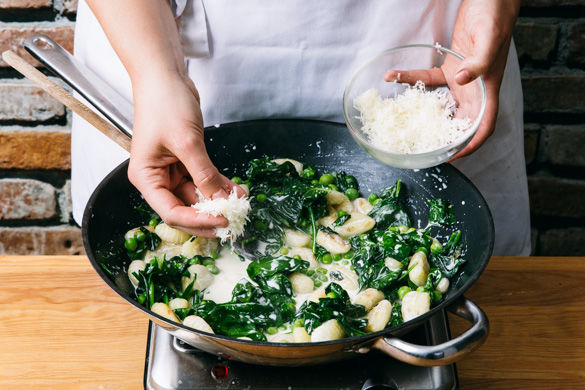 Kannst du diesen kleinen, runden Kartoffelklößchen widerstehen? Wie sie da so in ihrer cremigen Sahnesauce liegen, gemeinsam mit den knackigen Erbsen und zartem Spinat? Wir auch nicht! Die Sauce wird mit frischem Zitronensaft und geriebenem Käse fein sommerlich abgeschmeckt, da werden Groß und Klein satt und zufrieden sein!