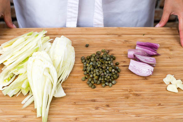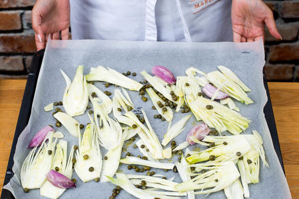 Den Backofen auf 200°C Umluft (220°C Ober-/Unterhitze) vorheizen. Den Fenchel in feine Scheiben schneiden. Die Schalotten schälen und längs halbieren. Den Knoblauch schälen und in feine Scheibchen schneiden. Die Kapern in einem Sieb abtropfen lassen.