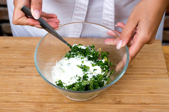 Die Petersilienblätter abzupfen, einige Blätter für die Garnitur beiseitelegen, die restlichen Blätter fein hacken. Die Dillspitzen abzupfen und fein schneiden. Die Zitrone abreiben und halbieren, eine Hälfte auspressen, die andere Hälfte in Spalten schneiden. Den Topfen mit den Kräutern, dem Zitronensaft und -abrieb sowie Salz und Pfeffer verrühren.