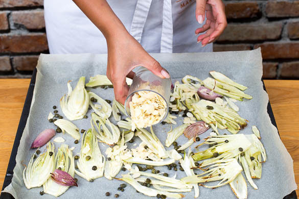 Die Mandelblättchen nach ca. 20Min. über dem Fenchel verteilen und 5–8Min. bei 160°C mitrösten, bis sie goldbraun sind.