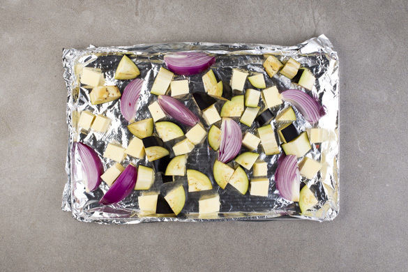 Den Backofen mit Grillfunktion auf 250°C vorheizen. Ein Backblech mit Alufolie auslegen. Den Paneer in 1,5cm große Würfel schneiden. Die Auberginen ebenfalls in 1,5cm große Würfel schneiden. Die Zwiebeln schälen, halbieren und die Hälften in je 4 Spalten schneiden.
