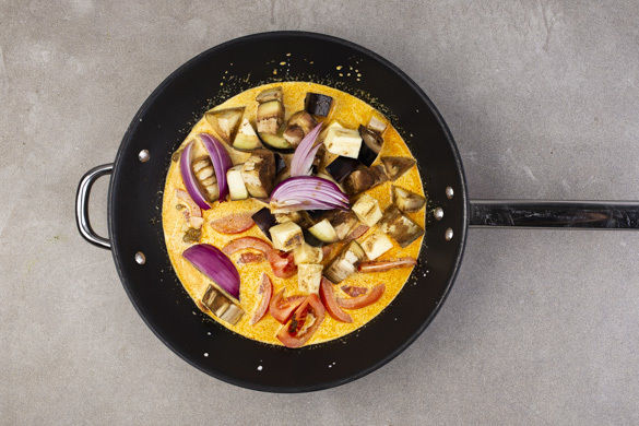 Mmmh, schon der Duft lässt uns das Wasser im Munde zusammenlaufen. Käse, Auberginen und Zwiebeln werden mit Garam Masala gewürzt und im Ofen gebacken, die cremige Kokosmilchsauce wird mit Korma-Currypaste und gerösteten Mandelblättchen verfeinert. Dazu gibt es lockere Quinoa. Lasst es euch schmecken!