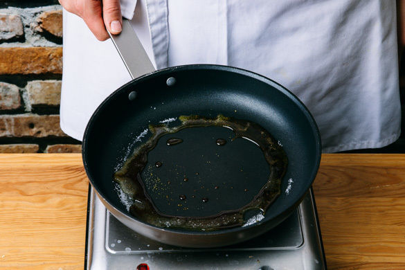 Die Mandeln in die Pfanne geben und gut mit dem Karamell vermischen, dann die Masse auf einem eingefetteten Stück Backpapier dünn verstreichen und bis zum Servieren auskühlen lassen.