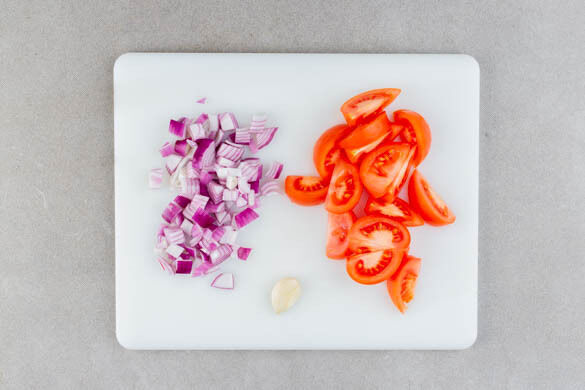 Die Zwiebel schälen, halbieren und mittelfein würfeln. Den Knoblauch mit dem Handballen oder einem Messer platt drücken und die Schale entfernen. Die Tomaten achteln.