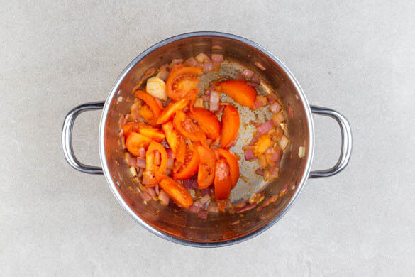 Die Zwiebeln den Knoblauch und die Tomaten mit 1TL Salz in einem großen Topf mit 1EL Pflanzenöl bei mittlerer bis starker Hitze ca. 5Min. braten, bis die Zwiebeln glasig werden und die Tomaten zerfallen.