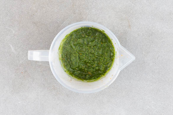 Mit etwas Wasser ablöschen, sodass der Boden des Topfes bedeckt ist. Die Gewürzmischung und 1 Prise Zucker einrühren. ⅔ des Spinats zugeben und ca. 2Min. zusammenfallen lassen. Das Saag aus dem Topf nehmen und in einem hohen Gefäß fein pürieren. Der Topf wird weiterverwendet.
