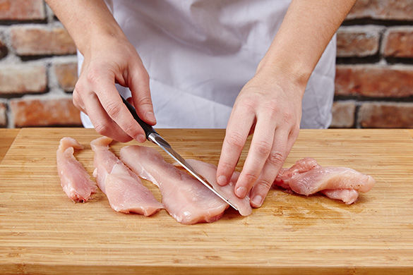 Die Hühnerbrüste der Länge nach in flache Schnitzel schneiden. Den Ofen auf 220°C Ober- und Unterhitze vorheizen.
