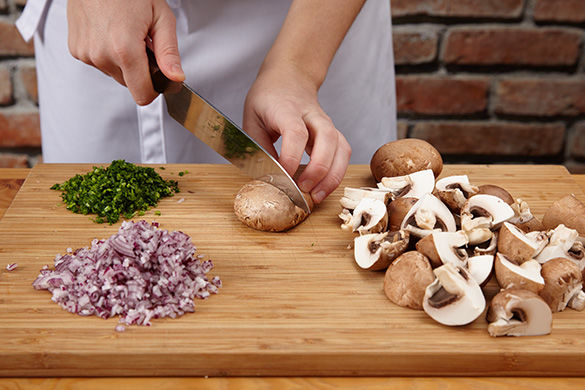 Inzwischen die Zwiebel schälen und in feine Würfel schneiden. Die Champignons mit Küchenkrepp oder einer Pilzbürste von evtl. Dreck befreien und vierteln. Die Petersilie mit den Stengeln fein hacken.